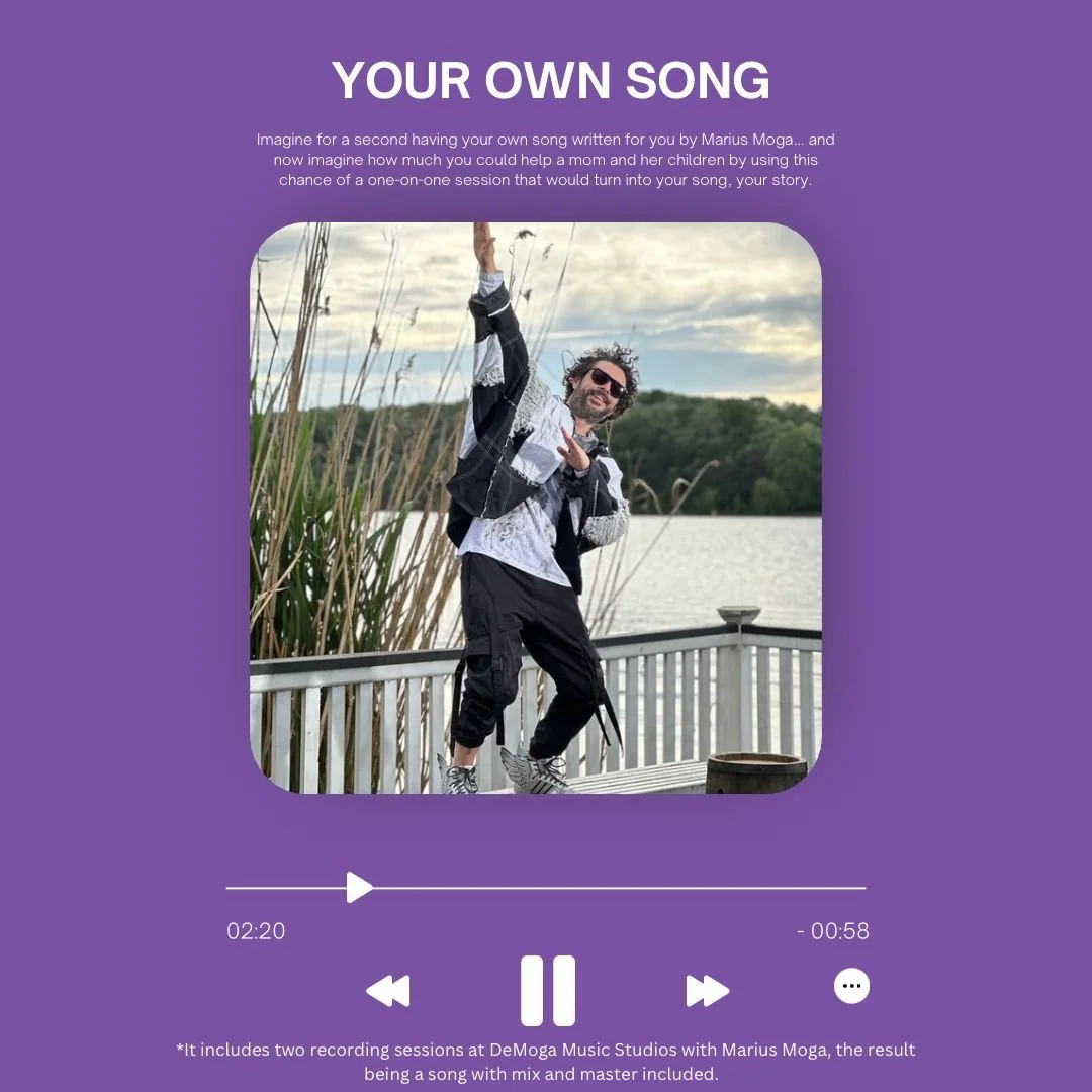 LOT 104: Cum ar fi să ai propria melodie compusă de Marius Moga și, în același timp, să ajuți o mamă să fie mai sănătoasă? Pachetul pe care îl poți achizitiona include două sesiuni one-on-one de înregistrări la DeMoga Music Studios, din care va rezulta o melodie care să îți aparțină.